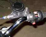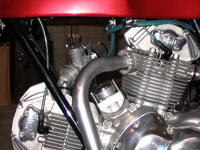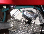 I put a Dyna ignition and coils on this bike. At the time I started this the two popular ignitions were Dyna and Rita. The Rita system is no longer in production however. I'm sure there are others out there, but the Dyna was pretty affordable and seems to be working well. It all fits under the stock cover too, with no black boxes or anything to deal with. The only thing that bothered me was the wires were housed in a grey cover. I slipped them into a black tube to blend in better before I installed everything. Installation wasn't too difficult, especially since the engine was already apart and on the bench. I did have to re-index the gears to get it timed correctly, but that wasn't a big surprise. The other main task was making a mount for the coils. I've seen various methods used - I went with a pretty simple bracket that bolts to the frame on an existing tab. The first picture on the left shows the bare bracket, in position on the frame. The coils need to be mounted under this bracket to clear the tank. You can see the coils in the second picture from the left. (click on photos for a larger version) The ignition switch itself has been moved from under the tank up on to the dash. One of the benefits of using an 860GTS(?) dash! If you go this route on you'll need the smaller diameter switch - the stock switch from the later bikes (under tank switch) is too big to fit between the gauges. I think the earlier switch that goes by the sidecovers would work. Plug wires came from Guzzino.com. I think the stock wires were black, but I used some with a green plaid pattern as used on earlier bikes. The plug caps are NGKs with the logos blacked out. The kill switch is from a late model Superbike. That's a pretty horrible picture on the right, but it gives you an idea of what I'm talking about. The starter button is of course worthless, but I'm guessing not many people will notice. Call it an anti-theft device - theives are for the most part rather dim so maybe they'll hit the button and figure the bike's dead? You never know... |